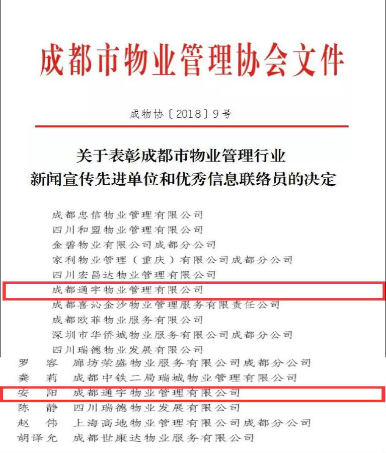 10月9日下午,成都市物業(yè)管理協(xié)會(huì )下發(fā)了“關(guān)于表彰成都市物業(yè)管理行業(yè) ‘新聞宣傳先進(jìn)單位’和‘優(yōu)秀信息聯(lián)絡(luò )員’的決定”,成都通宇物業(yè)管理有限公司同時(shí)斬獲以上兩項殊榮。