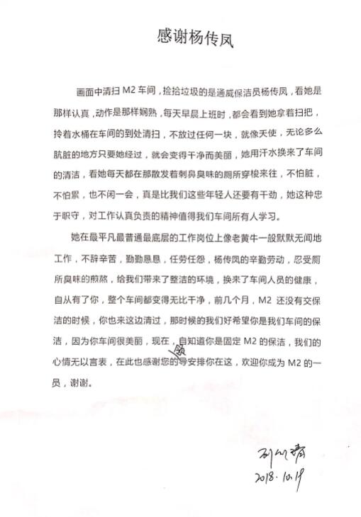 “勤勤懇懇、任勞任怨,在車(chē)間里,無(wú)論多么臟亂的地方,只要她經(jīng)過(guò),就會(huì )變得干凈而美麗?!弊鳛橐幻硖幰痪€(xiàn)的普通員工,自入職以來(lái),楊傳鳳以嫻熟、認真的動(dòng)作在M2車(chē)間里進(jìn)行著(zhù)環(huán)境清潔工作,通過(guò)她默默地付出換來(lái)了車(chē)間整潔美麗的工作環(huán)境。也正是因為她在崗位上認真、勤懇的工作態(tài)度,贏(yíng)得了園區車(chē)間主任和其他員工的高度評價(jià)——“她就像老黃牛一樣默默付出著(zhù),不怕臟、不怕累,勤勤懇懇,任勞任怨,比我們這些年輕人都還要有工作的熱情和干勁。她這種忠于職守、默默奉獻的精神,值得車(chē)間里所有人學(xué)習?!?/span>