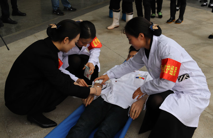 醫療組為傷員進(jìn)行傷口包扎和處理