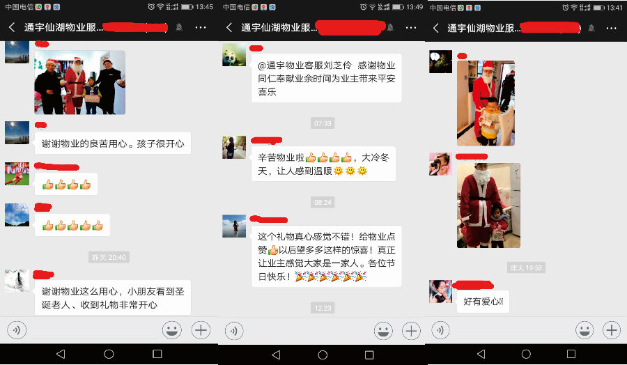 夜幕降臨,平安夜的氣氛越來(lái)越濃,仙湖公館的物業(yè)工作人員自發(fā)當起了圣誕老人,給業(yè)主們派發(fā)祝福和禮物,瞬時(shí)小區內開(kāi)始沸騰起來(lái),大人和孩子們都沉浸在這溫馨而又歡樂(lè )的氣氛里。眾多業(yè)主紛紛表示“感謝物業(yè)同事們的辛勤付出,孩子們都非常開(kāi)心,謝謝通宇物業(yè)!”