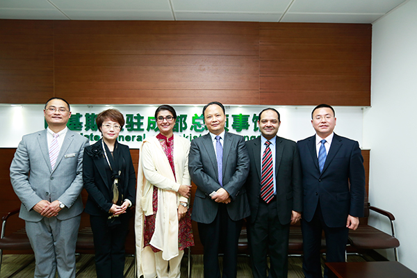 劉漢元主席、禚玉嬌總裁與巴基斯坦駐成都總領(lǐng)事阿納姆?博魯什及商務(wù)領(lǐng)事博哈利合影