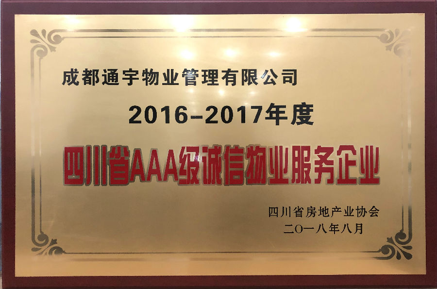 與此同時(shí),2018年3月,根據四川省人民政府《關(guān)于加快推進(jìn)社會(huì )信用體系建設的意見(jiàn)》工作部署,為進(jìn)一步加快推進(jìn)我省物業(yè)服務(wù)行業(yè)信用體系建設,樹(shù)立物業(yè)服務(wù)企業(yè)依法誠信經(jīng)營(yíng)的良好形象,四川省房地產(chǎn)業(yè)協(xié)會(huì )組織開(kāi)展了“2016-2017年度四川省物業(yè)服務(wù)行業(yè)誠信評價(jià)”活動(dòng)。通宇物業(yè)憑借在企業(yè)經(jīng)營(yíng)管理制度、精神文明建設、客戶(hù)滿(mǎn)意度、誠信納稅情況、公共設施設備保養、社會(huì )公益事業(yè)等方面所取得的優(yōu)異成績(jì),一舉榮獲“2016-2017年度四川省AAA級誠信物業(yè)服務(wù)企業(yè)”。