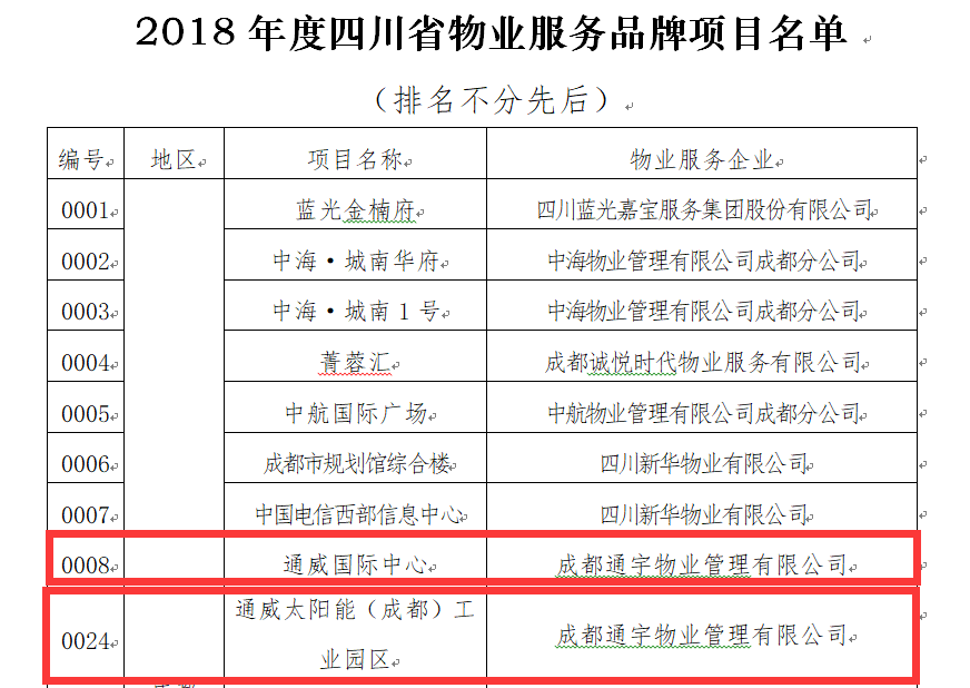 為貫徹落實(shí)國家、省、市有關(guān)發(fā)揮品牌引領(lǐng)作用推動(dòng)供需結構升級的部署,引導四川省物業(yè)服務(wù)企業(yè)在推動(dòng)品質(zhì)提升和品牌創(chuàng )建中的積極作為,更好地滿(mǎn)足人民日益增長(cháng)的美好生活的需要,并提高自主品牌知名度和影響力,省房協(xié)物專(zhuān)委2018年在全省范圍內開(kāi)展四川省物業(yè)服務(wù)品牌項目推介工作。通宇物業(yè)積極響應,第一時(shí)間成立專(zhuān)項工作小組準備創(chuàng )優(yōu)材料,并對照標準進(jìn)行自查自糾。經(jīng)前期企業(yè)自行申報、各地初評上報、省專(zhuān)家現場(chǎng)評定、網(wǎng)絡(luò )公示等程序,最終評選出以通威國際中心、通威太陽(yáng)能(成都)工業(yè)園區為代表的170余個(gè)四川省物業(yè)服務(wù)品牌項目。