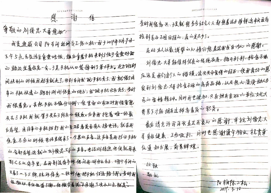3月9日下午5點(diǎn)左右,通威太陽(yáng)能合肥有限公司P4車(chē)間員工陳先生在休息時(shí),由于自己一時(shí)疏忽大意,不慎將手機遺失在園區的綠化草坪中,隨后恰巧被園區物業(yè)秩序維護員劉俊忠巡檢時(shí)拾得。在發(fā)現手機遺失后,陳先生內心焦急萬(wàn)分,立刻用同事手機與自己手機進(jìn)行聯(lián)系,未曾想電話(huà)那頭竟然被秩序維護員劉俊忠接通了,通過(guò)核實(shí)基本信息后,劉俊忠與其約定見(jiàn)面地點(diǎn)并將手機歸還給陳先生,陳先生連聲對劉俊忠表示衷心感謝。