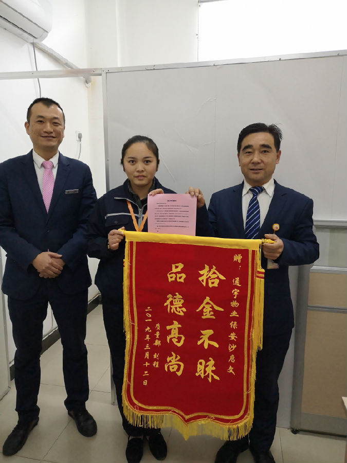 在領(lǐng)取到遺失的錢(qián)包并確認相關(guān)物品完好后,劉先生連聲表示感謝。為由衷地表達這份感激之情,讓更多的人向沙啟文這種拾金不昧的高尚品格學(xué)習,劉先生專(zhuān)門(mén)制作了一幅錦旗并委托部門(mén)主管親自送到物業(yè)服務(wù)中心。