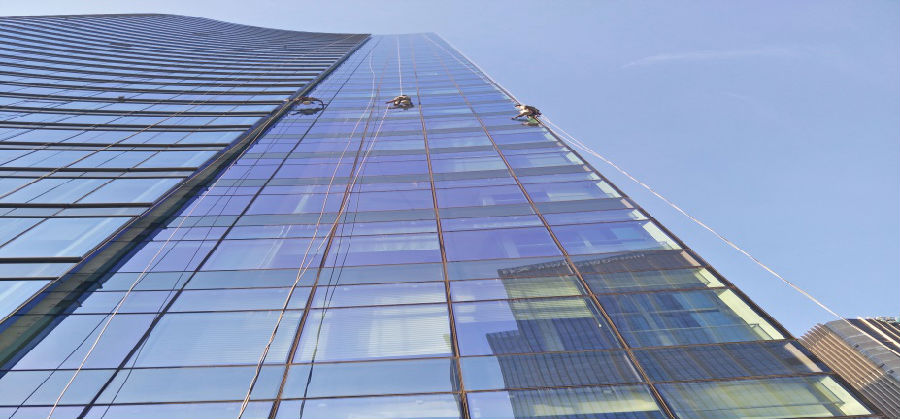 施工中,為確保清洗工作安全開(kāi)展,施工過(guò)程中工作人員穿戴整齊,按規定系好安全帶,在現場(chǎng)指揮員的指揮下嚴格按操作流程一絲不茍地實(shí)施外墻清洗,現場(chǎng)污水清理到位,確保做到嚴格規范,萬(wàn)無(wú)一失。清洗后,通威國際中心五萬(wàn)平方的幕墻玻璃將煥然一新。