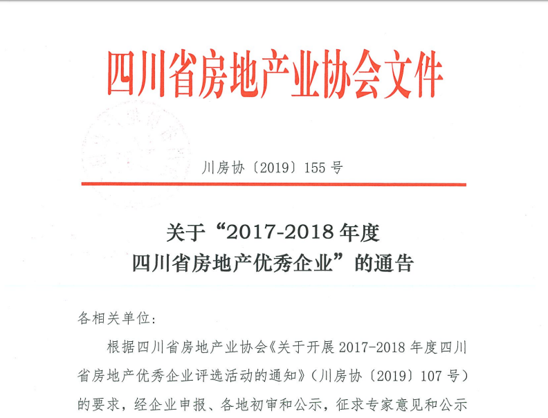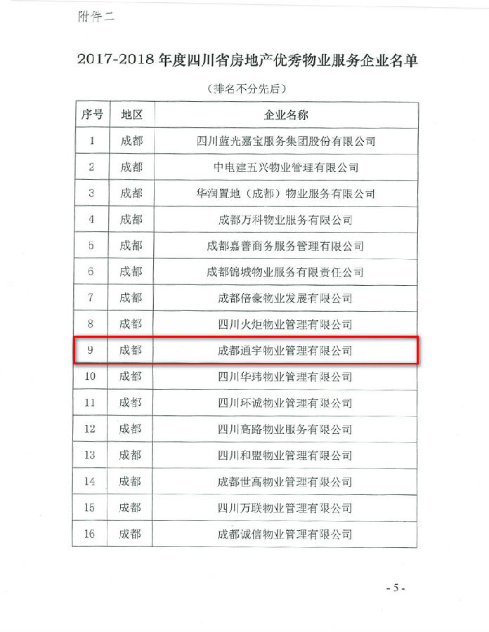 9月30日,四川省房地產(chǎn)業(yè)協(xié)會(huì )對外發(fā)布公告,授予179家本土企業(yè)“2017-2018年度四川省房地產(chǎn)優(yōu)秀企業(yè)”稱(chēng)號,成都通宇物業(yè)管理有限公司榮膺“四川省房地產(chǎn)優(yōu)秀物業(yè)服務(wù)企業(yè)”榮譽(yù)稱(chēng)號。
