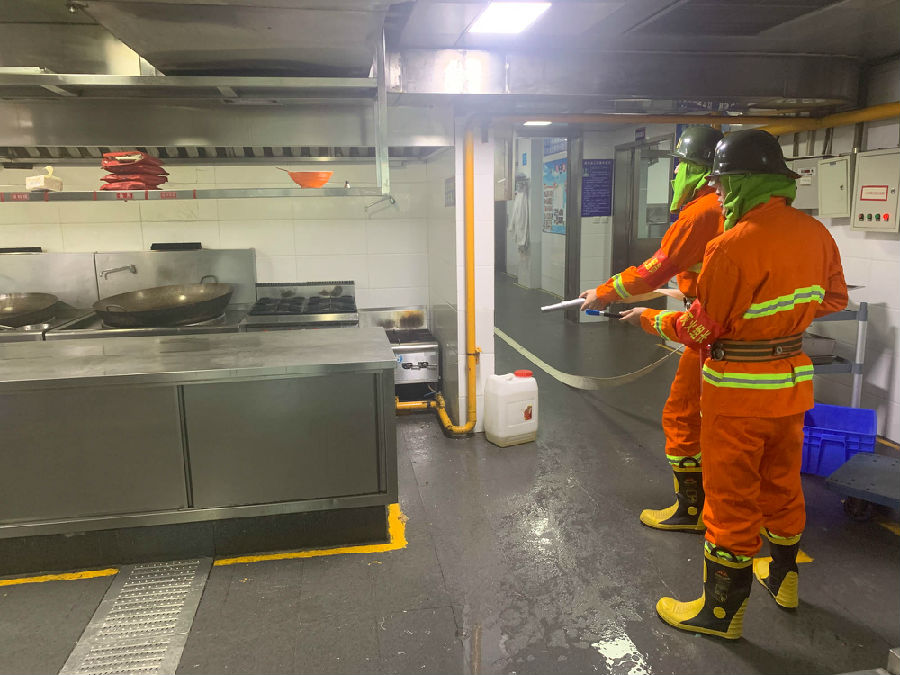 本次演練課題為大樓3樓的某餐廳發(fā)生“油盆火災”,物業(yè)人員迅速組織疏散人員?!盎鹎椤卑l(fā)生后,現場(chǎng)升起的濃煙觸發(fā)了煙霧報警裝置。身處監控室的隊員發(fā)覺(jué)火情后,立即拉響警報,啟動(dòng)應急預案,撥打119聯(lián)絡(luò )消防單位進(jìn)行救援。
