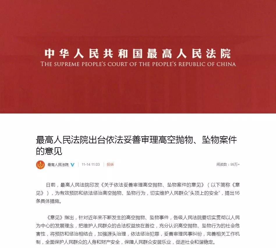 “懸在城市上空的痛”,觸痛了所有人的神經(jīng)。最近,國家再次加碼重點(diǎn)懲治這種嚴重威脅公眾安全的不文明現象。11月14日,最高法發(fā)布了《關(guān)于依法妥善審理高空拋物、墜物案件的意見(jiàn)》,為有效預防和依法懲治高空拋物、墜物行為,切實(shí)維護人民群眾“頭頂上的安全”,提出了16條具體措施。