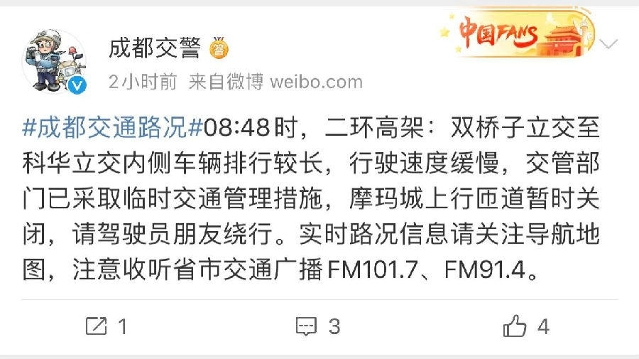 成都交警發(fā)布了自1月30日以來(lái)連續18天內首條“堵車(chē)提示”