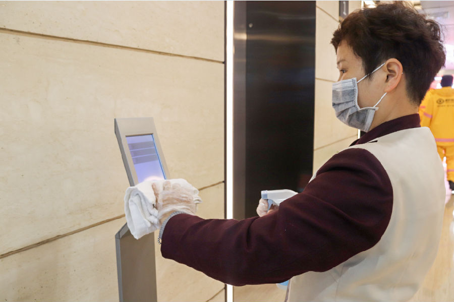 TIC環(huán)境部員工對電梯按鍵進(jìn)行消毒