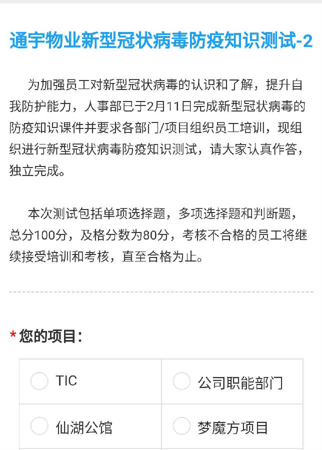 新冠肺炎的特征是什么,如何有效截斷傳播途徑?目前疫情發(fā)展趨勢如何?復工高峰來(lái)臨,如何做到持續對病毒“嚴防死守”的同時(shí)保障有序復工? 近日,針對大家關(guān)心的一系列問(wèn)題,由通宇物業(yè)人事部組織策劃,各項目全員參與,采取線(xiàn)上學(xué)習、在線(xiàn)考核的方式進(jìn)行了覆蓋公司全員的新冠肺炎疫情專(zhuān)題培訓,幫助基層員工正確認識疫情,在有效保護自身的同時(shí),為業(yè)主提供更安全、專(zhuān)業(yè)的服務(wù)。