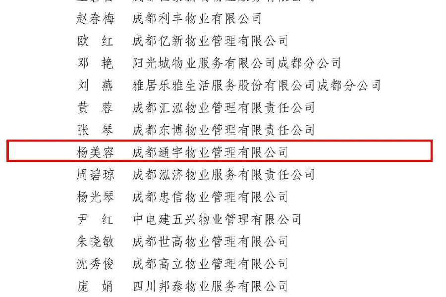 3月7日,在國際“三八”婦女節來(lái)臨之際,一年一度的成都市物業(yè)服務(wù)“三八行業(yè)標兵”評選活動(dòng)圓滿(mǎn)落下帷幕,在本次活動(dòng)中,成都通宇物業(yè)管理有限公司楊美容榮膺2020年度成都市物業(yè)服務(wù)“三八行業(yè)標兵”榮譽(yù)稱(chēng)號。