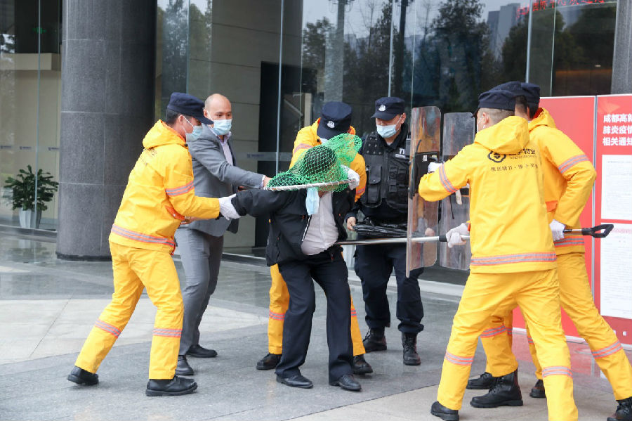 “報告總指揮,人員集合完畢,請指示!”“演練開(kāi)始!”下午2時(shí)許,隨著(zhù)現場(chǎng)總指揮一聲令下,反恐聯(lián)合演練正式開(kāi)始。本次演練模擬場(chǎng)景是在疫情持續期間,某外來(lái)人員宣稱(chēng)自己是確診病例欲強行闖入TIC大樓,被秩序部執勤隊員勒令阻止后爆發(fā)沖突,持刀沖擊門(mén)崗。監控中心隨即通知項目PTU小組,同時(shí)上報公司領(lǐng)導及轄區派出所,請求支援,并立即啟動(dòng)防控應急預案,對事發(fā)地點(diǎn)進(jìn)行人流管控。接警后,4名項目PTU小組隊員在1分鐘內到達現場(chǎng),趁其不備,從身后發(fā)起攻擊,采用防爆網(wǎng)、防爆盾牌、防爆叉等迅速將“暴徒”繳械制服,立即押送至臨時(shí)隔離點(diǎn),對人員及設備進(jìn)行消毒處置,并配合派出所警力將“嫌疑人”妥善安置。整個(gè)突發(fā)事件在5分鐘內即得到迅速處理,警報解除。