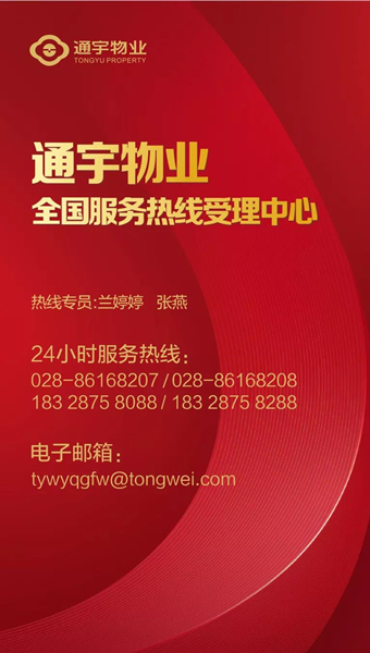 通宇物業(yè)以成都為中心,輻射雙流、樂(lè )山、眉山、西昌、合肥、包頭、保山等地,管理項目涵蓋寫(xiě)字樓、住宅、商業(yè)綜合體、工業(yè)園區等。為滿(mǎn)足業(yè)主快速解決問(wèn)題的需求、踐行公司標準化建設,公司全國物業(yè)服務(wù)熱線(xiàn)統一升級、專(zhuān)項投訴郵箱組開(kāi)通受理,通過(guò)優(yōu)化和完善服務(wù)流程的每個(gè)細節,提升對客服務(wù)的效率和水平,為業(yè)主提供24小時(shí)晝夜循環(huán)保障服務(wù),成為公司對外服務(wù)交流的重要渠道。