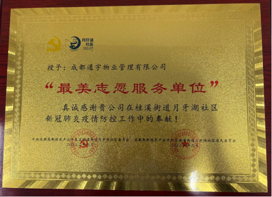 為加強與企業(yè)溝通交流,共同探索社區共建共治共享發(fā)展新路徑,近日,成都市高新技術(shù)產(chǎn)業(yè)開(kāi)發(fā)區桂溪街道月牙湖社區舉辦“月下同行,一起向未來(lái)”社區優(yōu)秀企業(yè)表彰儀式暨社區同行者交流會(huì )。會(huì )上,月牙湖社區黨委書(shū)記陳立容向在疫情時(shí)刻,有擔當、有奉獻精神的企業(yè)、商戶(hù)代表們送上最誠摯的感謝,通宇物業(yè)等企業(yè)被授予“最美志愿服務(wù)單位”。