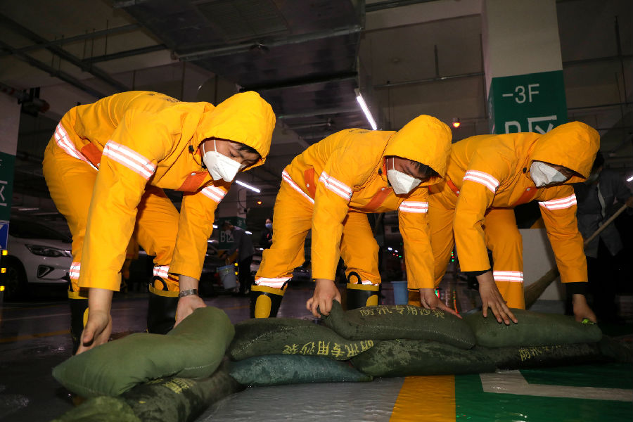 通威國際中心項目組織對方防汛沙袋