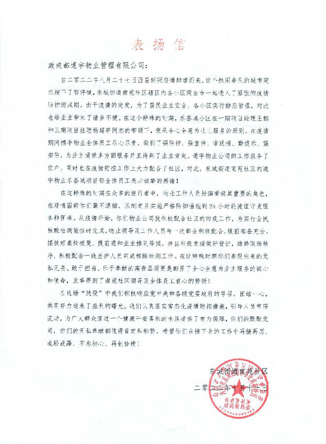 8月27日起,為有效排除風(fēng)險隱患,盡快阻斷疫情蔓延,西昌市進(jìn)入靜態(tài)管理,位于管控區域的通宇物業(yè)西昌樂(lè )薈城項目迅速響應、迎難而上,堅守疫情防控一線(xiàn),守護業(yè)主生命健康,體現了“最后一百米”的專(zhuān)業(yè)服務(wù)價(jià)值,彰顯了通宇物業(yè)的責任和擔當。因表現突出,通宇物業(yè)樂(lè )薈城項目收到了來(lái)自西昌市東城街道南苑社區的表?yè)P信。