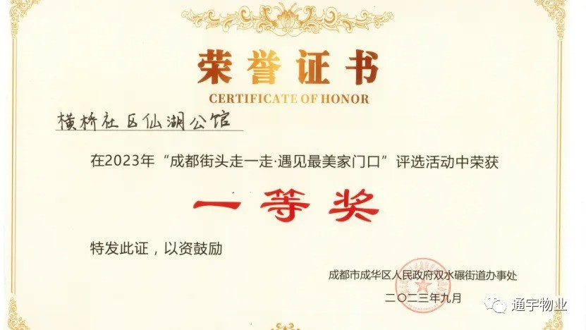為弘揚中華優(yōu)秀傳統文化,加強和諧社區建設,培育社區文明風(fēng)尚,豐富居民文化生活,9月29日,由成都成華區委社治委指導開(kāi)展了“成都街頭走一走·遇見(jiàn)最美家門(mén)口”評選,仙湖公館在本次評選中表現出色,榮獲一等獎。