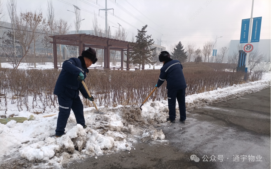 2月10日,農歷大年初一。在祖國北方的內蒙古通威項目迎來(lái)了新年的第一個(gè)嚴寒,大年初一的清晨溫度降至-16℃。極端天氣增加了物業(yè)工作的難度,特別是嚴寒的天氣造成的積雪,對道路及行人產(chǎn)生極大的安全隱患。通宇物業(yè)人迎著(zhù)凌冽的北風(fēng),第一時(shí)間進(jìn)行了清雪工作,為項目的安全生產(chǎn)提供了保障。