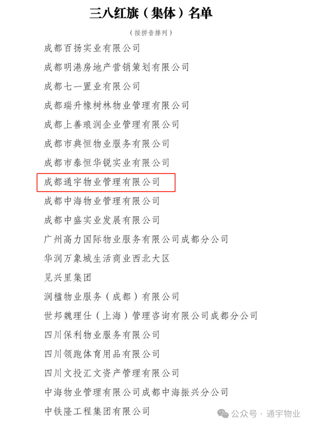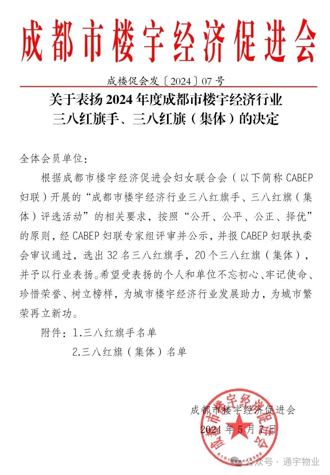 為表彰先進(jìn)、樹(shù)立榜樣,推動(dòng)樓宇經(jīng)濟行業(yè)持續發(fā)展,按照“公開(kāi)、公平、公正、擇優(yōu)”的原則,經(jīng)成都市樓宇經(jīng)濟促進(jìn)會(huì )婦女聯(lián)合會(huì )(CAB婦聯(lián))的嚴格評審,成都通宇物業(yè)管理有限公司榮獲“三八紅旗手(集體)”榮譽(yù)稱(chēng)號。