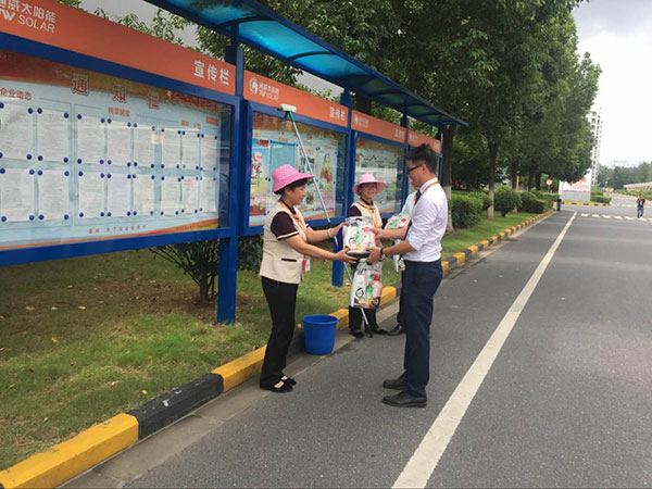 高溫下,為通威太陽(yáng)能(合肥)項目基層員工送上慰問(wèn)物品 此次“慶八一 送清涼”活動(dòng),黃總非常重視并特地安排,公司心系基層員工及退伍軍人,為他們送去了花露水、藥皂、防曬霜、毛巾等消暑用品,領(lǐng)導每到一處,都會(huì )對員工道一聲親切的問(wèn)候,并叮囑大家在工作中要做到安全第一,工作之余要充分休息,勞逸結合,勉勵大家克服高溫、疲勞等不利因素,合理安排工作和休息時(shí)間,并要求各一線(xiàn)員工在高溫期間一定要做好防暑降溫工作。 合影留念