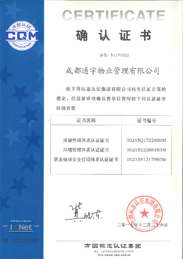 繼通過(guò)方圓標志認證集團審核組三標一體化管理體系現場(chǎng)監督審核后,近日,通宇物業(yè)順利取得三標一體化管理體系監督審核確認證書(shū),標志著(zhù)通宇物業(yè)質(zhì)量、環(huán)境、職業(yè)健康安全QES三標體系運行繼續有效。