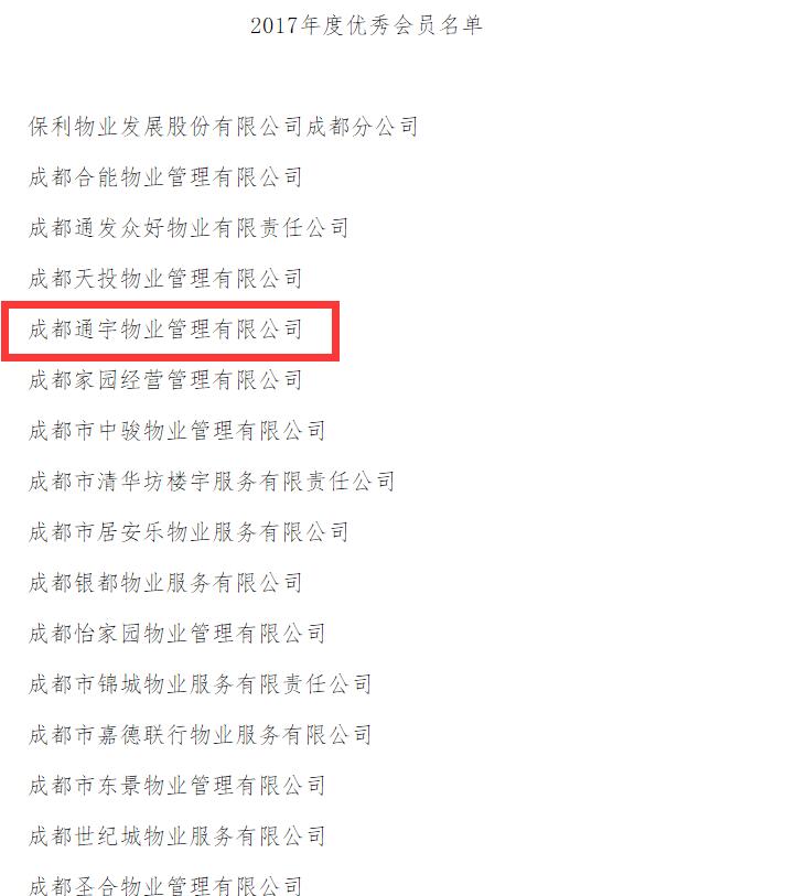 1月18日,成都市物業(yè)管理協(xié)會(huì )下發(fā)了《關(guān)于表彰2017年度優(yōu)秀會(huì )員的決定》,其中,成都通宇物業(yè)管理有限公司等企業(yè)獲成都市物業(yè)管理協(xié)會(huì )2017年度優(yōu)秀會(huì )員單位。