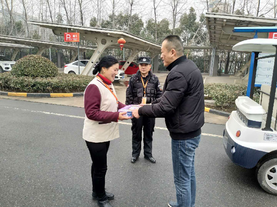 通威國際中心值班經(jīng)理付一夫為春節堅守在崗位的員工送去節日祝福和慰問(wèn)品