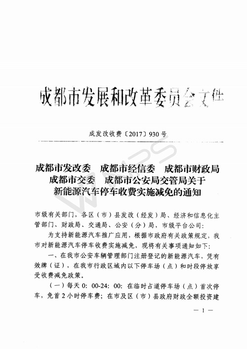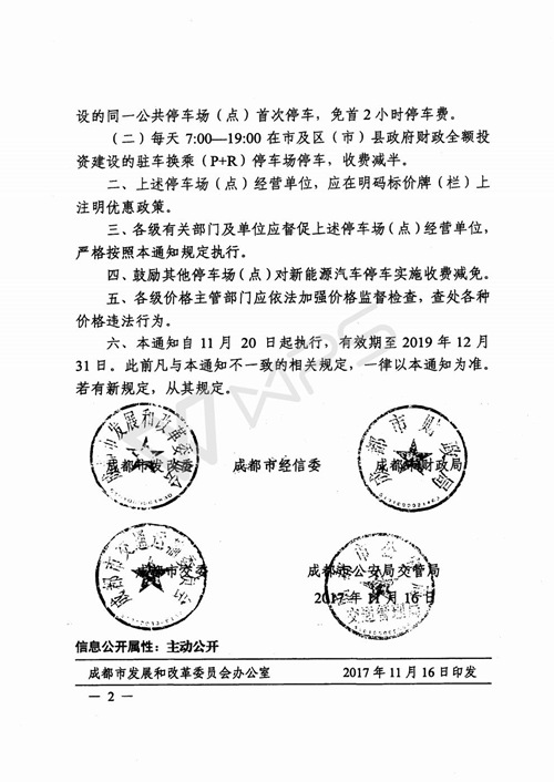 成都市發(fā)改委 成都市經(jīng)信委 成都市財政局 成都市交委 成都市公安局交管局關(guān)于新能源汽車(chē)停車(chē)收費實(shí)施見(jiàn)面的通知