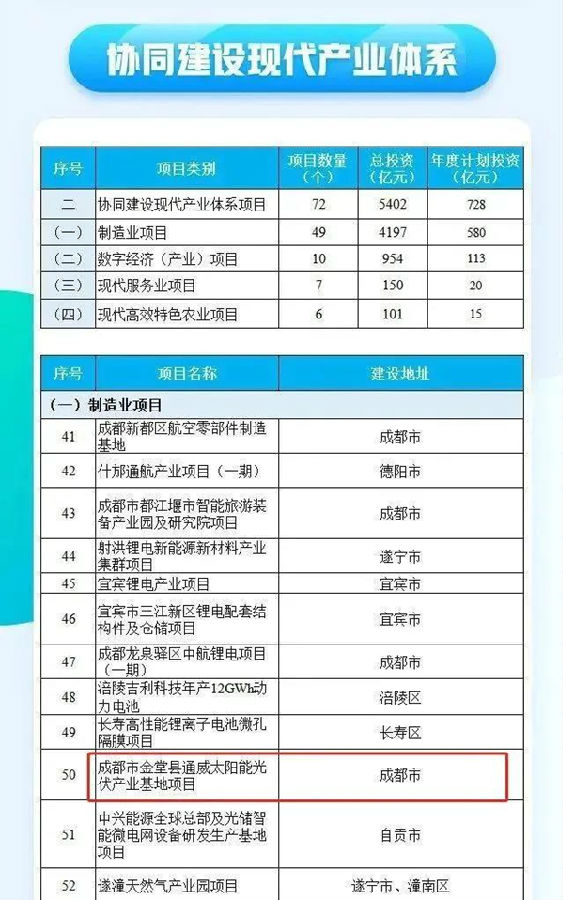 近日,推動(dòng)成渝地區雙城經(jīng)濟圈建設聯(lián)合辦公室正式印發(fā)《共建成渝地區雙城經(jīng)濟圈2022年重大項目名單》,通威太陽(yáng)能光伏產(chǎn)業(yè)基地項目名列其中。該名單共納入標志性重大項目160個(gè),總投資超2萬(wàn)億元,2022年計劃投資1835億元。