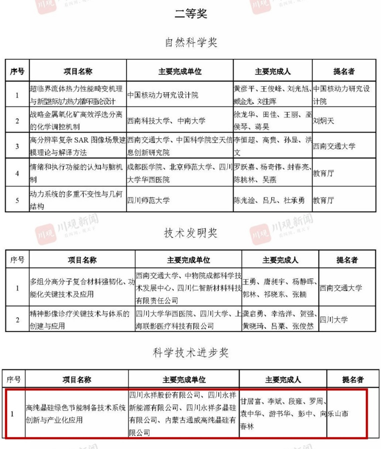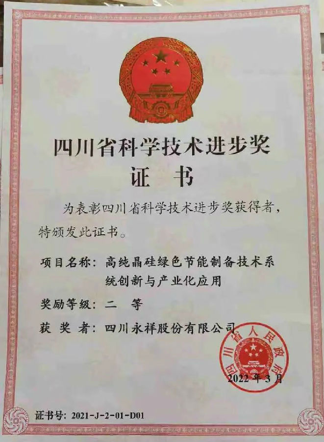 3月25日,四川省科學(xué)技術(shù)獎勵大會(huì )在成都舉行。會(huì )上公布了2021年度四川省科學(xué)技術(shù)獎獲獎名單,“頻譜資源同頻智能共用機理與方法”“地面遠距離射頻信號高精度同步傳輸技術(shù)及在國家重大工程應用”等261個(gè)項目獲得四川省科學(xué)技術(shù)獎。其中,由永祥股份、永祥新能源、永祥多晶硅、內蒙古通威高純晶硅主要完成的“高純晶硅綠色節能制備技術(shù)系統創(chuàng )新與產(chǎn)業(yè)化應用”獲四川省科學(xué)技術(shù)進(jìn)步獎二等獎。