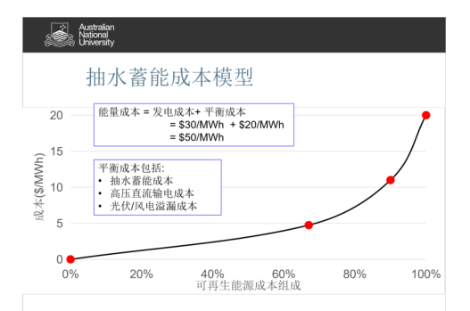 根據澳洲國立大學(xué)研究團隊的成本模型數據:使用100%可再生能源電力系統發(fā)電成本約$30/MWh,平衡成本約$20/MWh(含抽水蓄能、高壓直流輸電和光伏/風(fēng)電溢漏成本),總度電成本約為$50/MWh(約合人民幣0.32元/KWh)。