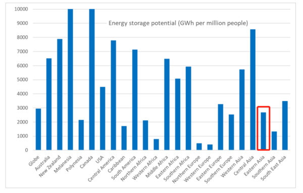 那么抽水儲能的整體規模究竟有多大呢?此前澳大利亞的研究團隊曾做過(guò)相應研究,其在全球發(fā)現了約61.6萬(wàn)個(gè)潛在可行的站點(diǎn)(含現有水庫),儲能容量約2300萬(wàn)GWh。其中,東亞地區有12.4萬(wàn)個(gè),儲能容量約為400萬(wàn)GWh,相當于每百萬(wàn)人口有2400GWh的潛在抽水儲能容量(按照16.7億人口計算)。