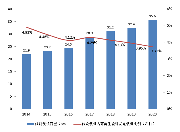 本來(lái)配套的儲能就缺,近幾年隨著(zhù)新能源發(fā)電跨越式發(fā)展,儲能的跛腿情況更加嚴重。根據CNESA數據,截至2020年末我國已投運儲能項目累計裝機規模35.6GW,占可再生能源發(fā)電裝機比重僅為3.73%,顯然儲能的裝機滯后可再生能源裝機。