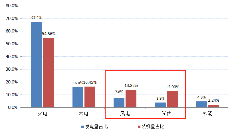 究其原因,光伏和風(fēng)電這類(lèi)可再生能源是典型的間歇性能源。什么意思?以風(fēng)電作為例子,一般在凌晨是風(fēng)力發(fā)電的高峰,但卻是用戶(hù)用電的低峰,發(fā)那么多電,用不完;等到早上用電高峰來(lái)了,結果風(fēng)停了,用戶(hù)又用不上風(fēng)電。這也是為什么風(fēng)電、光伏的發(fā)電量與裝機量占比存在較大差異。